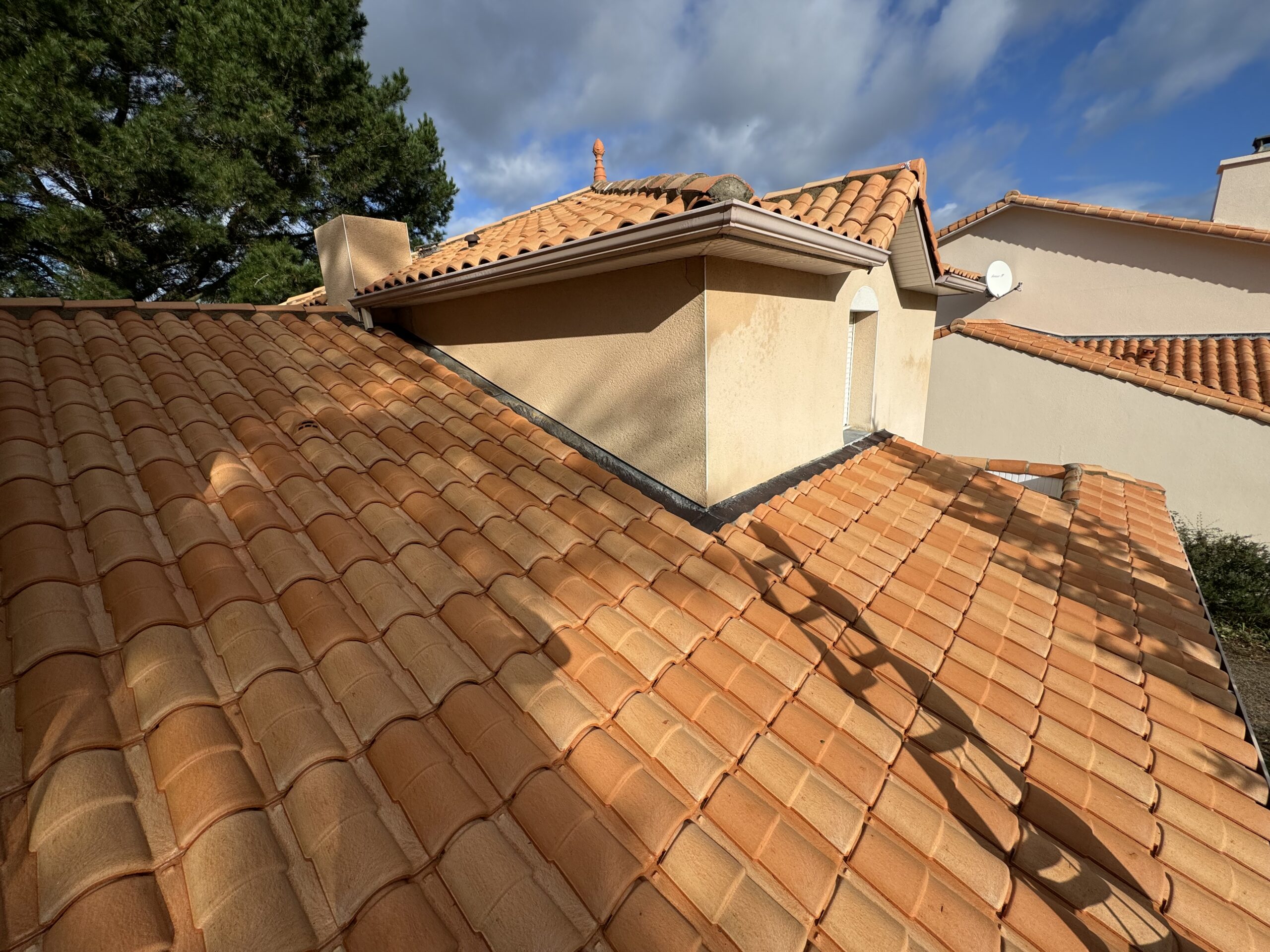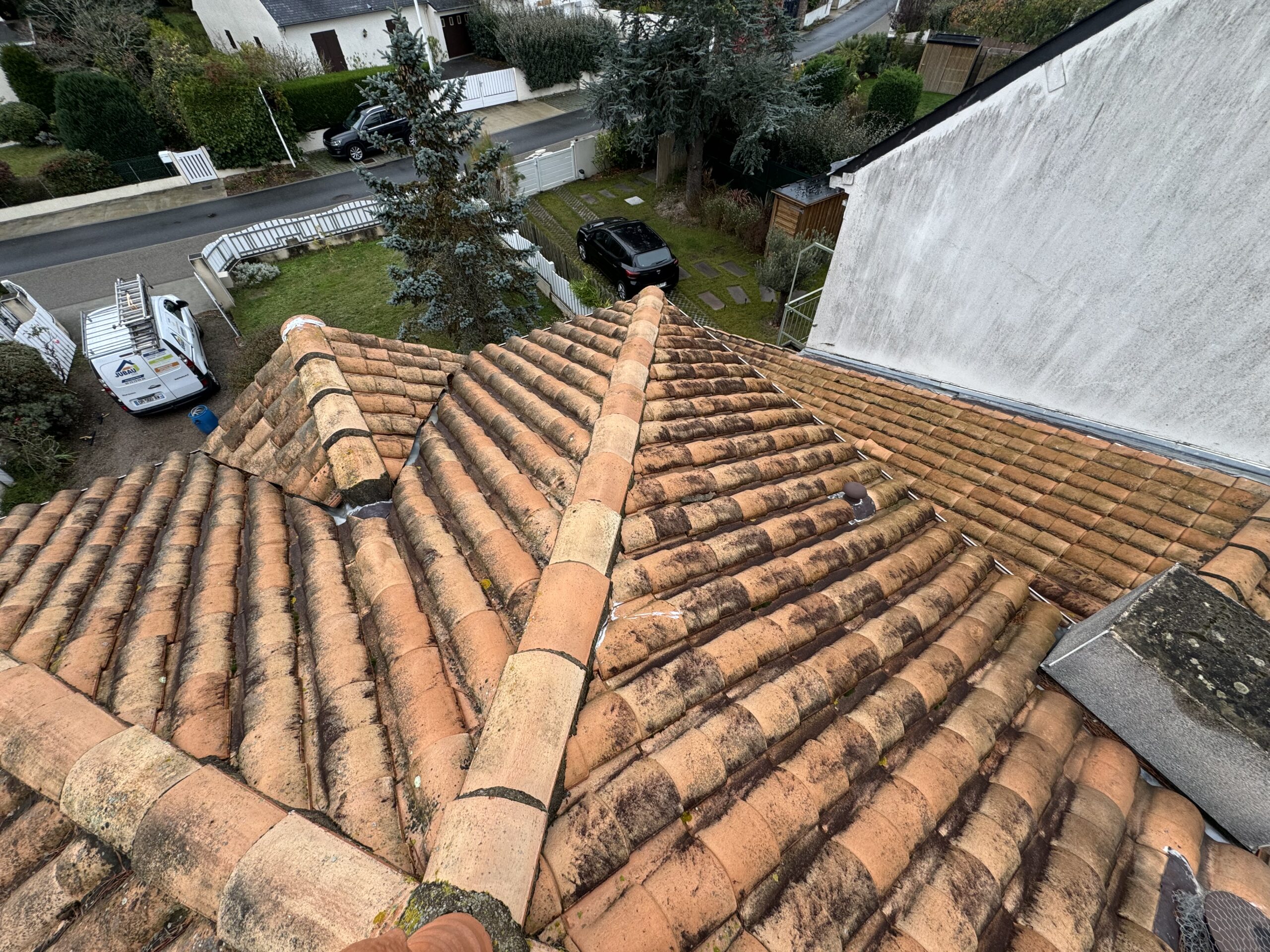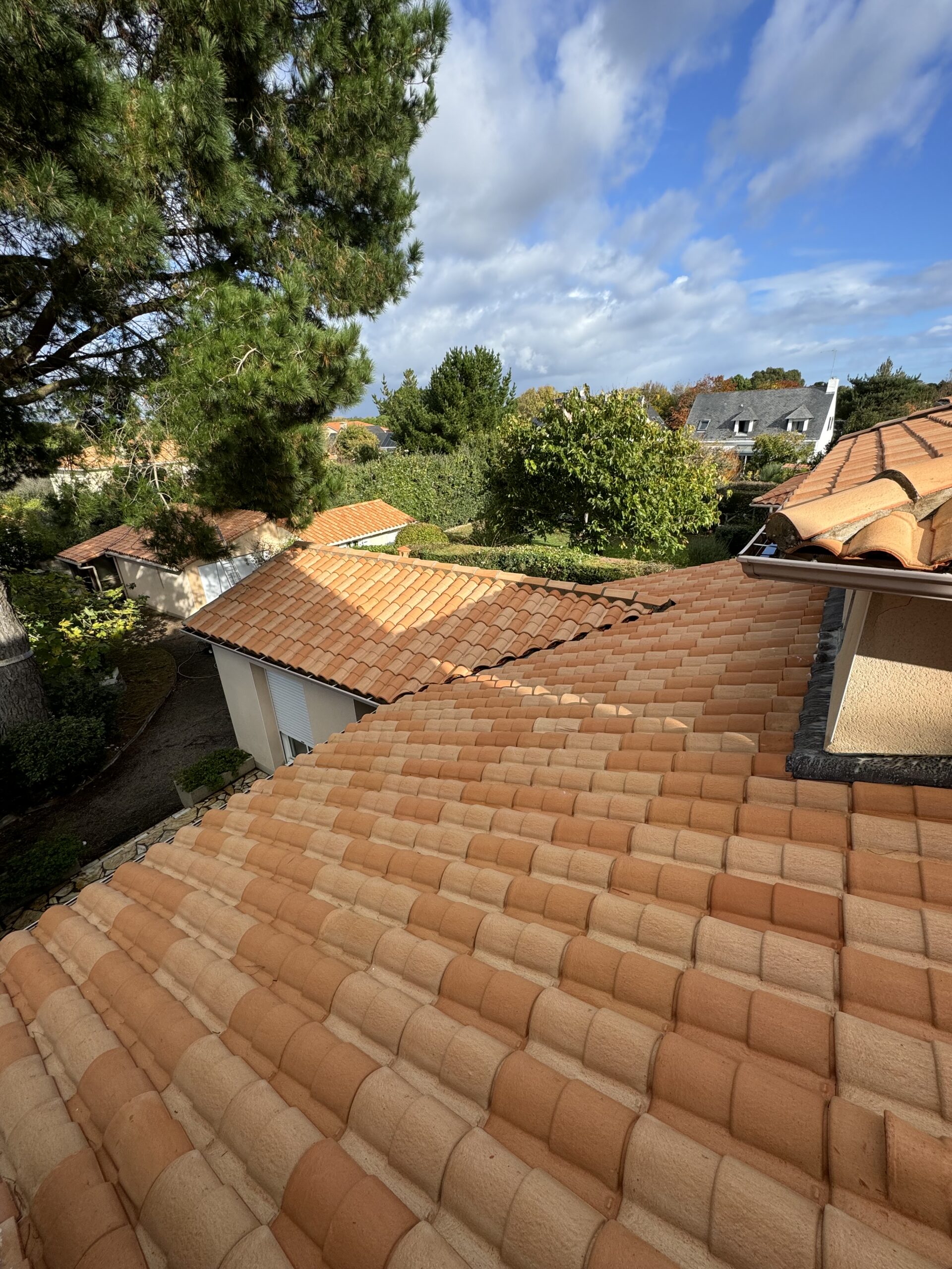Un nettoyage haute pression maîtrisé a été réalisé pour éliminer mousses, lichens et dépôts atmosphériques sans endommager les tuiles.