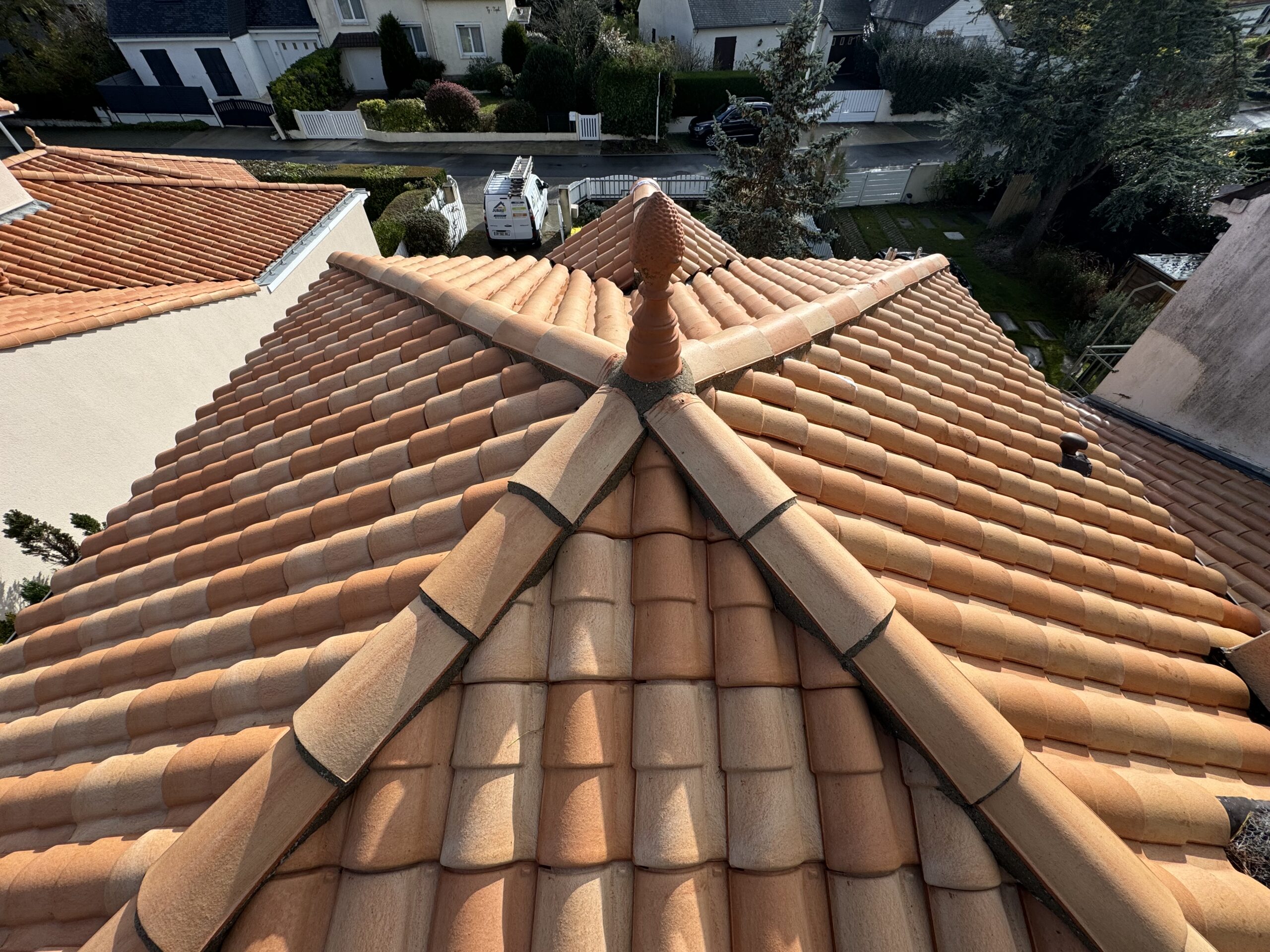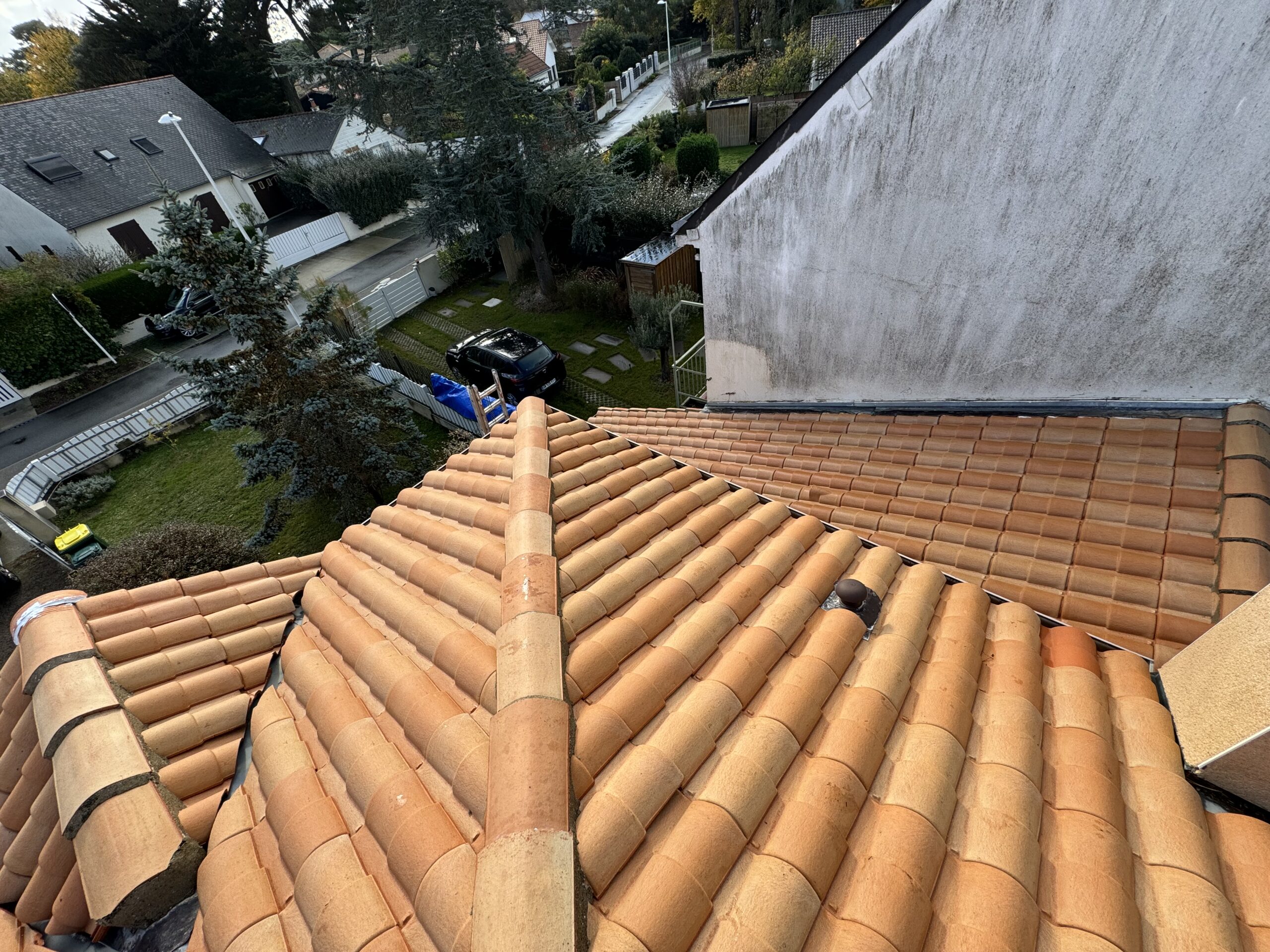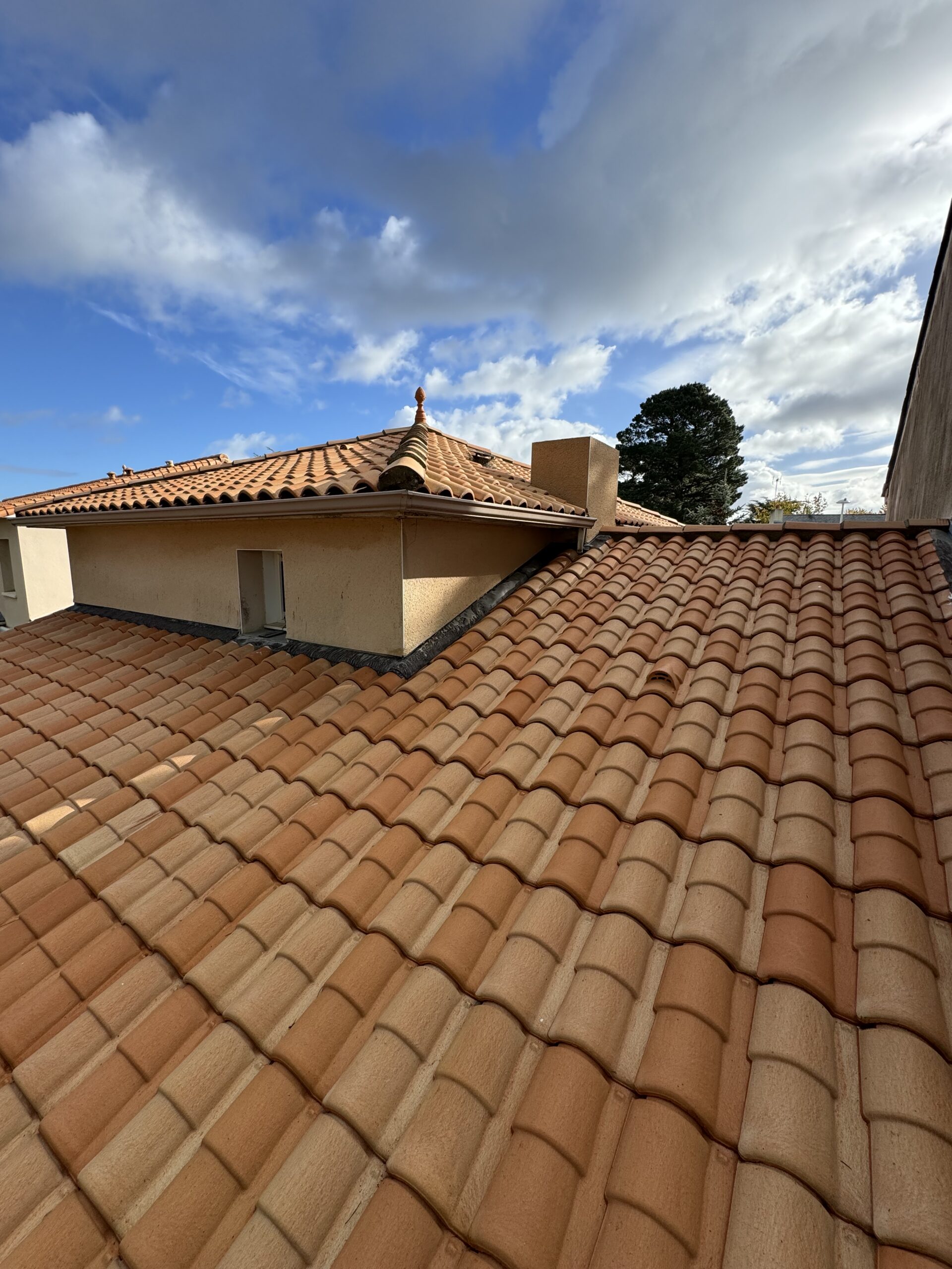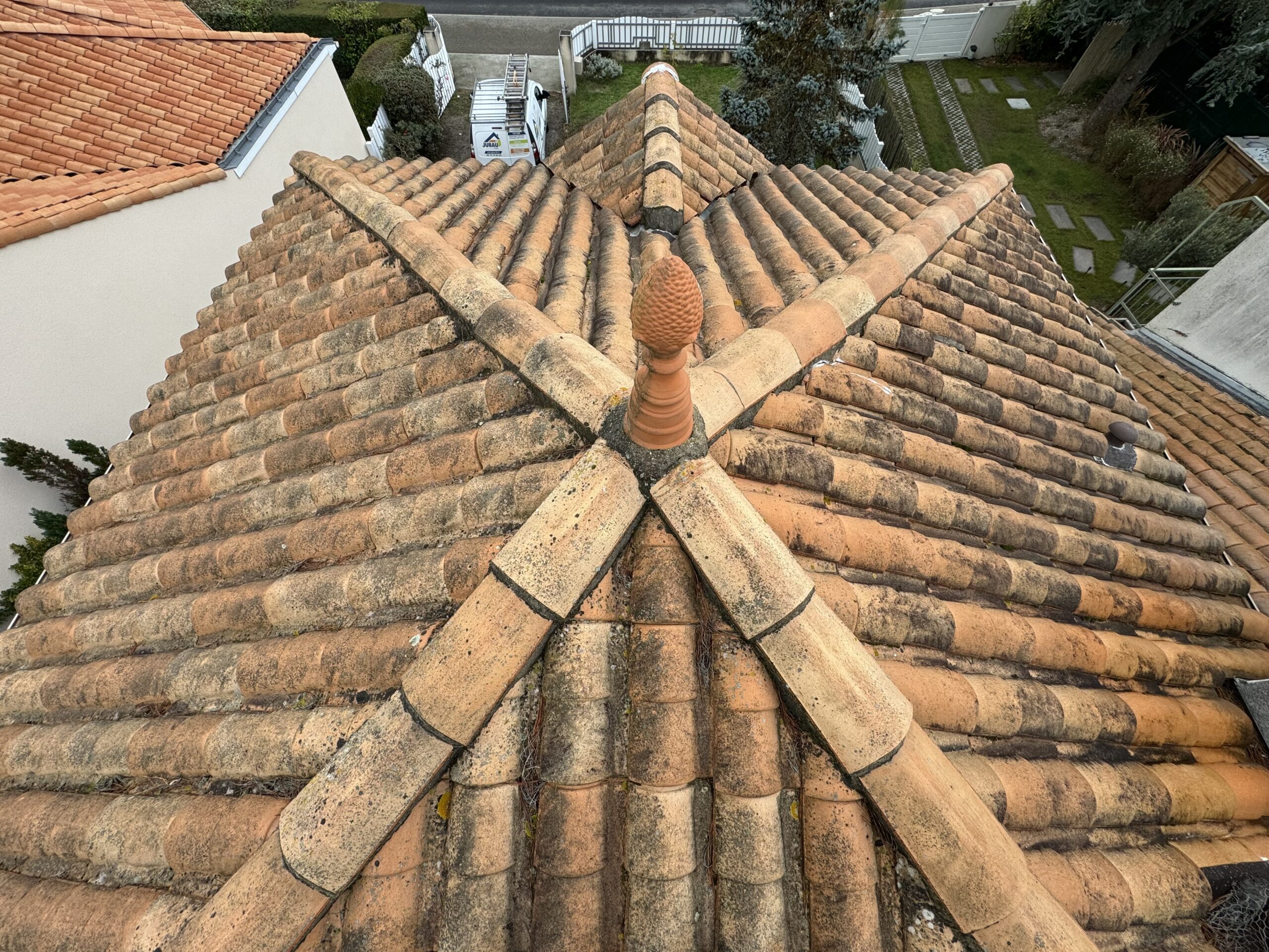 Un nettoyage haute pression maîtrisé a été réalisé pour éliminer mousses, lichens et dépôts atmosphériques sans endommager les tuiles.