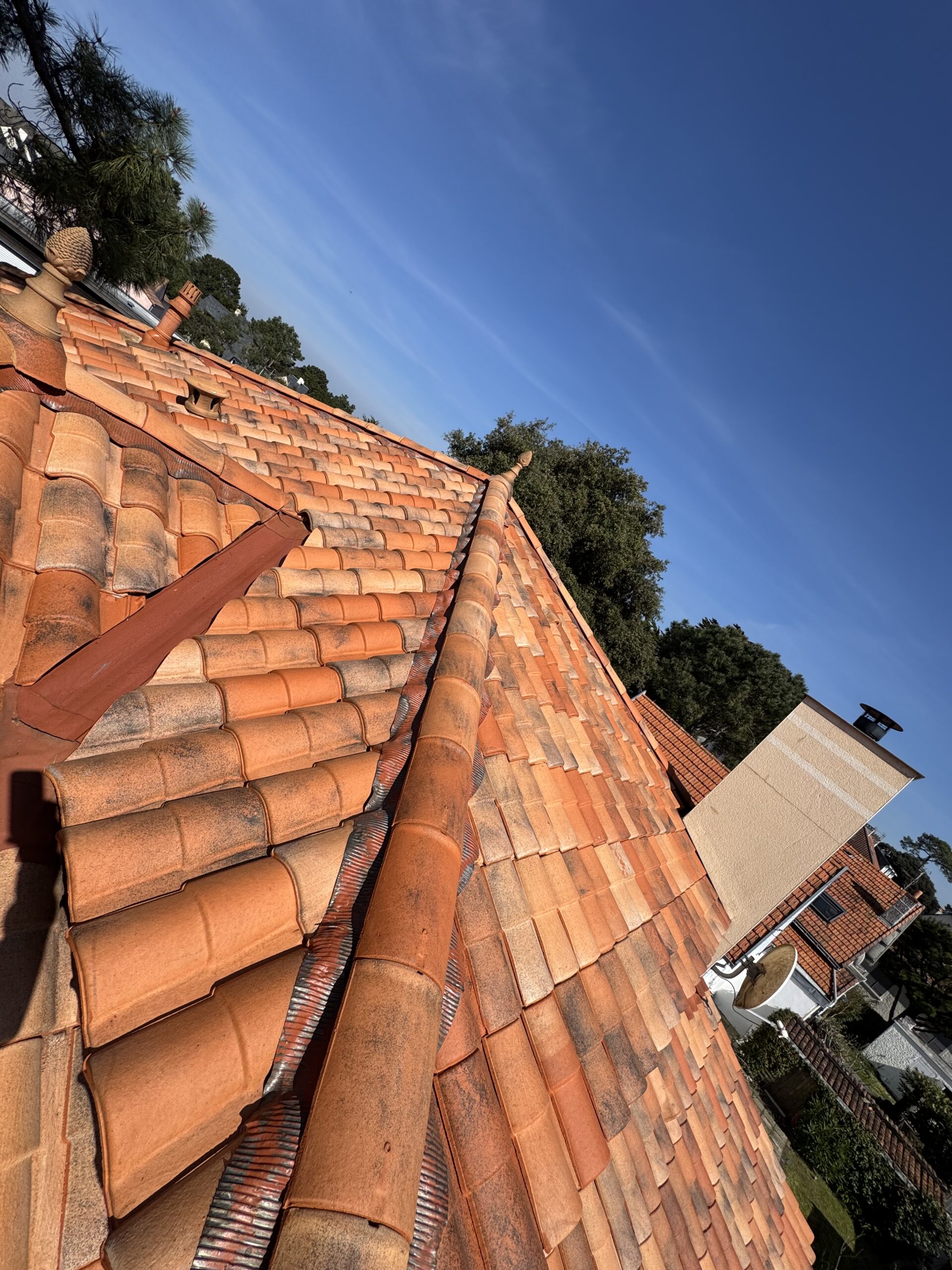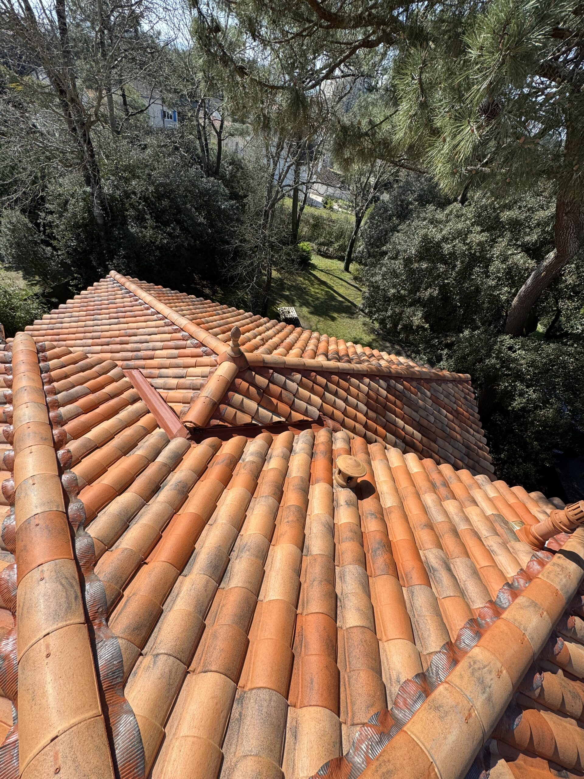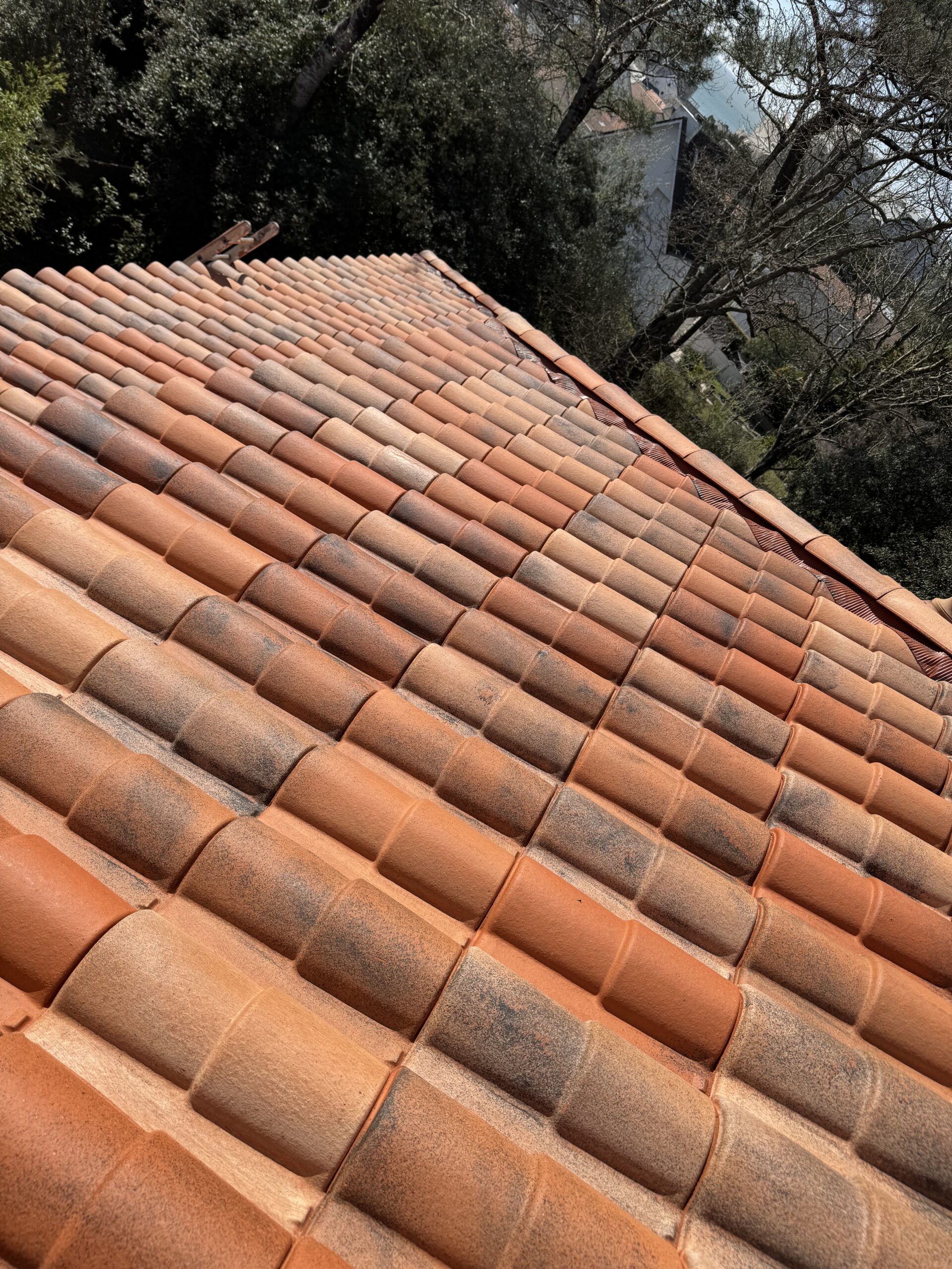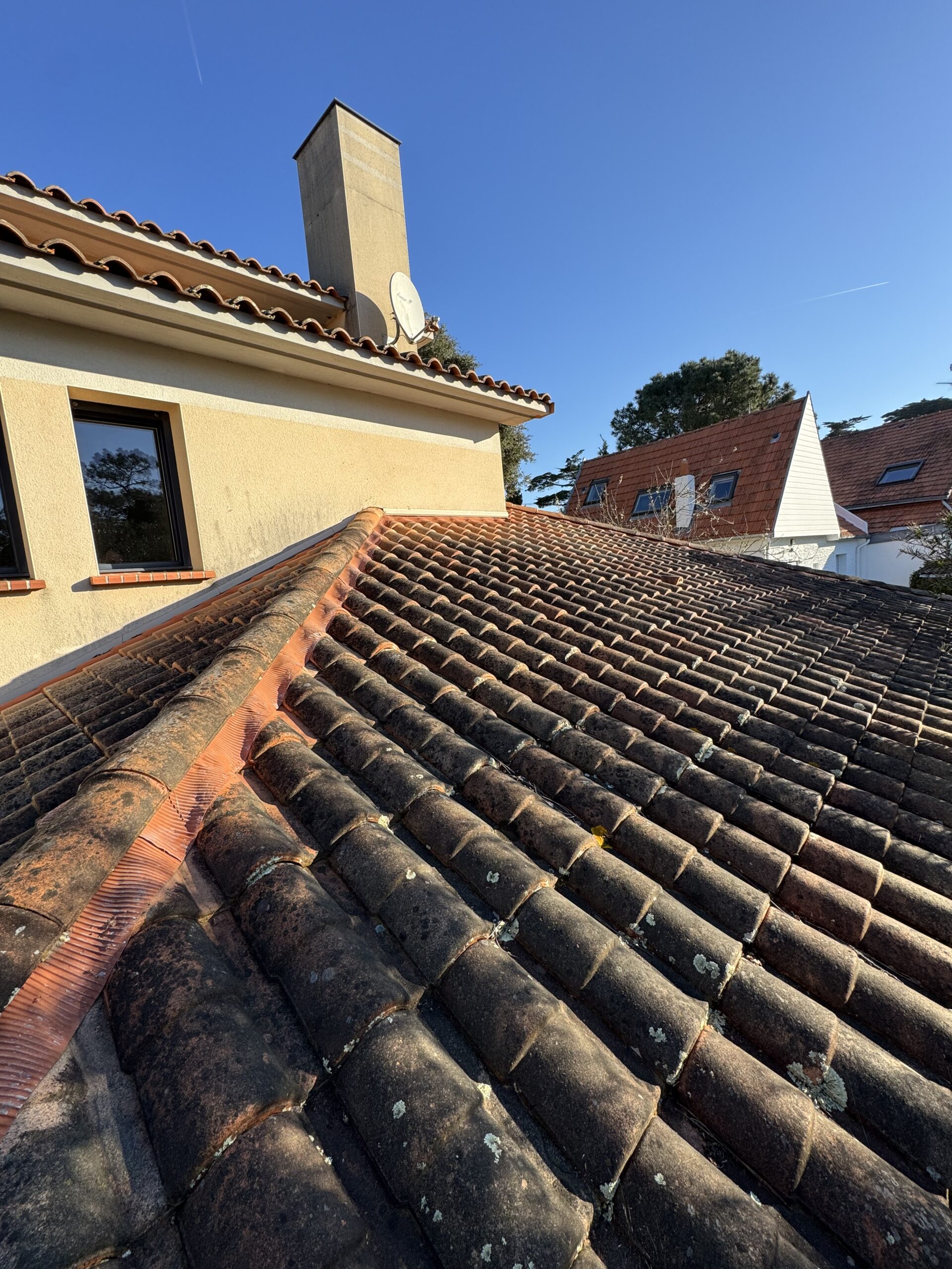 Nous avons commencé par un nettoyage en profondeur de la toiture afin d’éliminer toutes les salissures, mousses et dépôts présents sur les tuiles terre cuite.